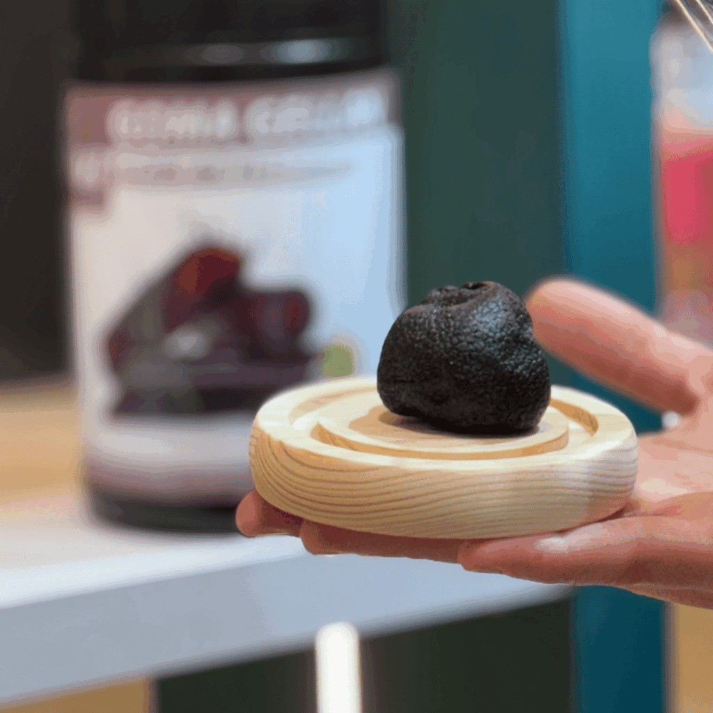 The result is a bite that encapsulates the essence of the truffle in a precise and versatile form. Thanks to its heat resistance, this faux truffle can be incorporated into dishes that require heat—from pasta and risotto to creams and sauces—without altering its structure. Its adaptable format allows it to be molded according to the chef’s creativity: into small spheres, cylinders, or even blocks ready to be grated over a finished dish, evoking the classic gesture of using fresh truffles.