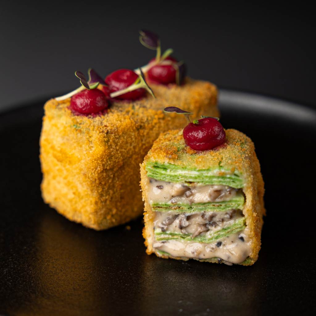• Assembly: Deep-fried lasagna stuffed with mushroom and soy bechamel sauce with spinach crepes