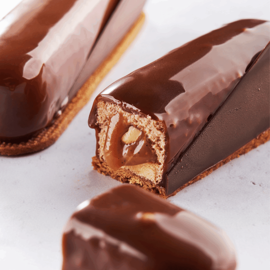 The glaze, made with Guanaja chocolate, delivers a deep shine and an intense flavor that envelops the bar in an elegant, luxurious coating. Thanks to Proglaçage, its smooth and stable application ensures a flawless finish and a visual result as striking as its taste.