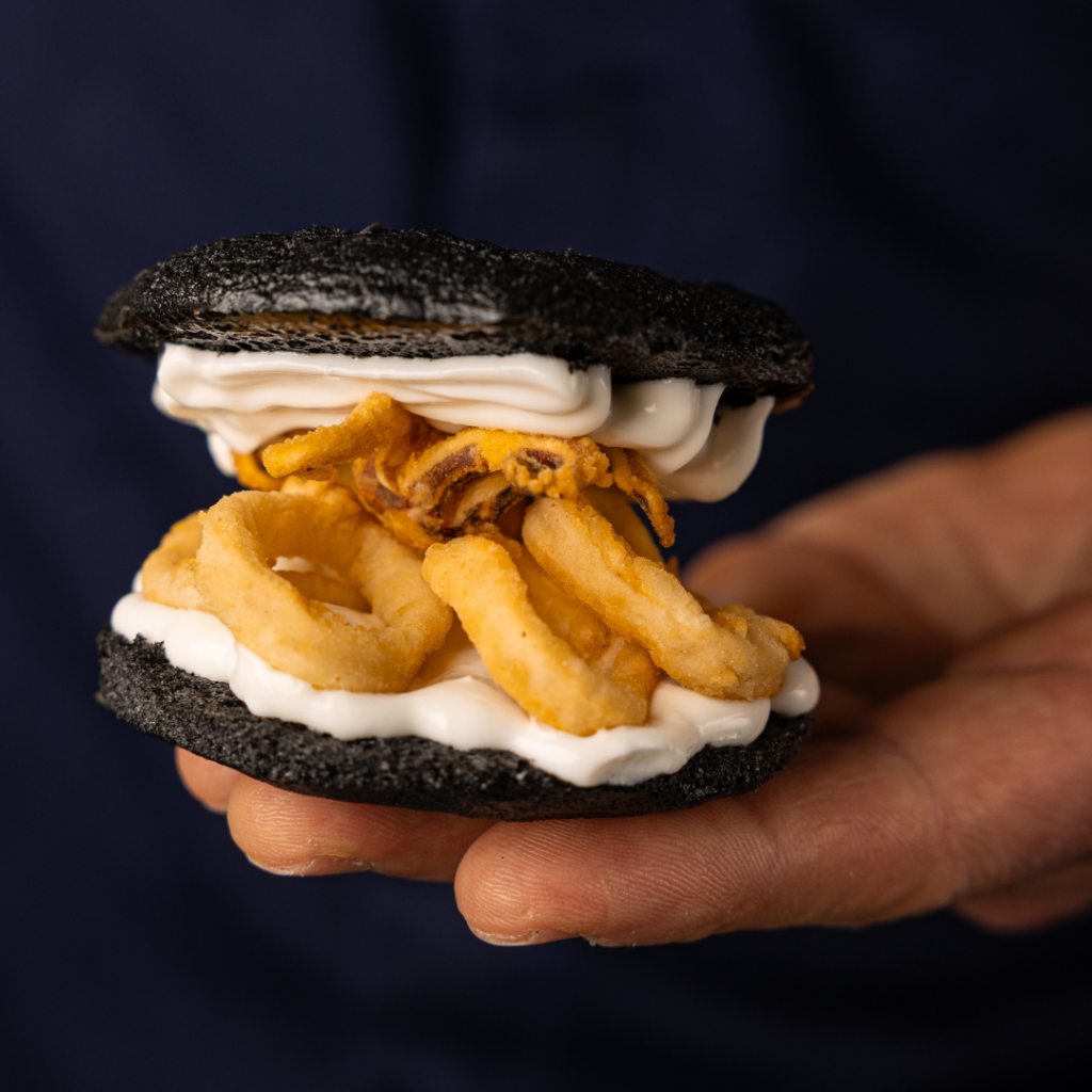 “I wanted to make the hamburger bun by dehydrating a baked squid ink meringue with Albuwhip Free Range” – Chef Carlos Mastre.
