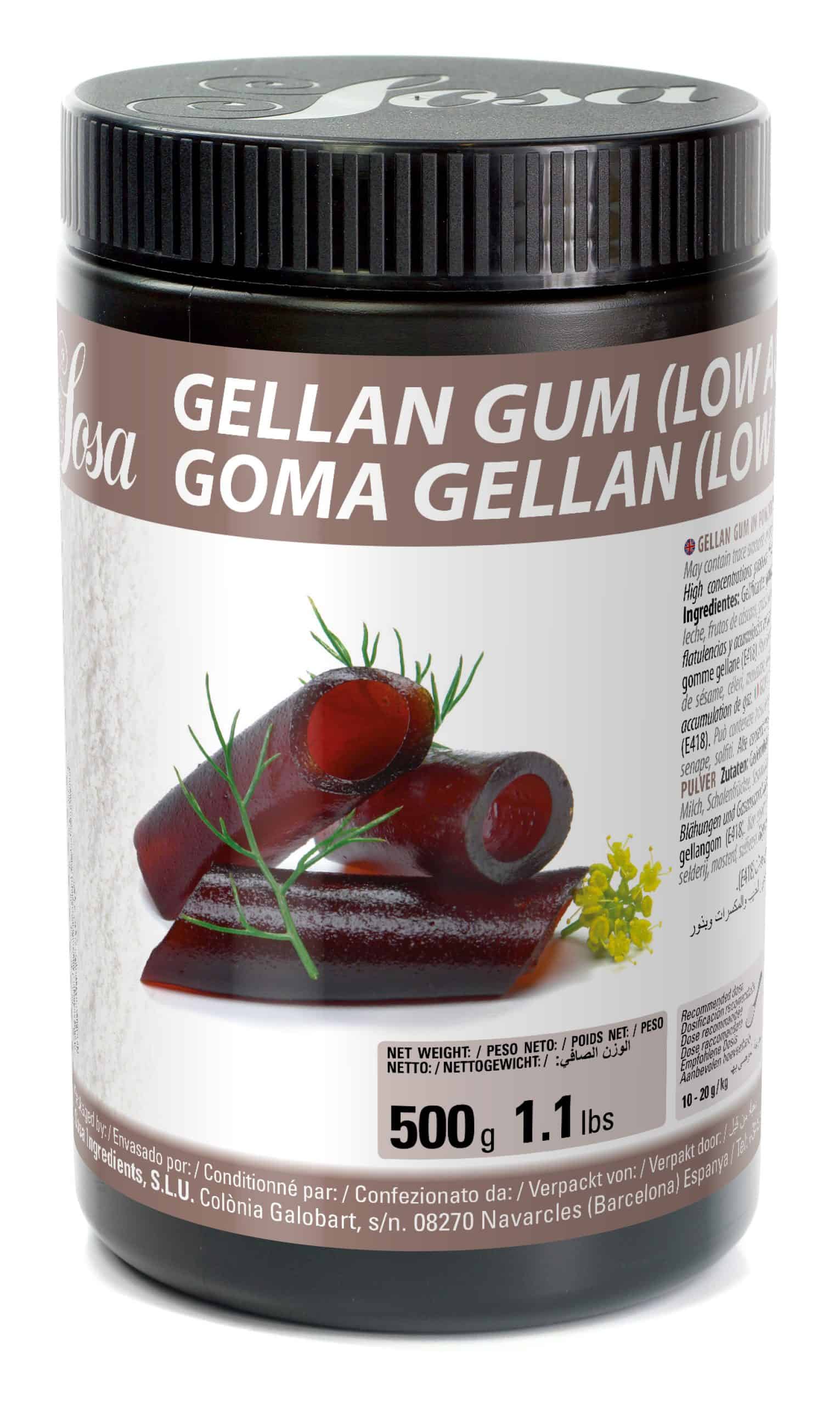 La gomme gellane est un gélifiant d'origine végétale issu d'une fermentation bactérienne. Sa texture est très proche de celle de l'Agar-agar, à la différence que la gomme Gellan supporte des températures plus élevées, ce qui permet de produire des gélatines pour les fourrages cuits au four.