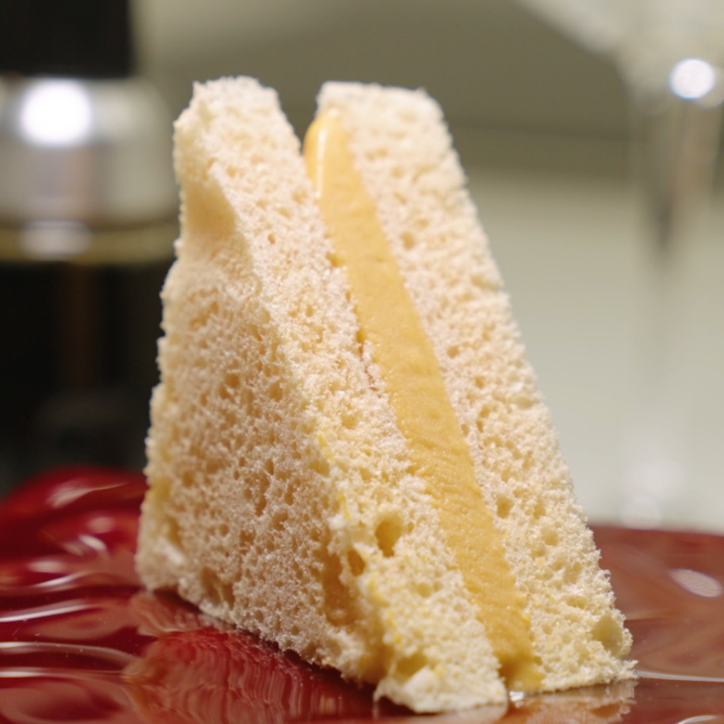 L’expérience est complétée par un geste sensoriel qui renforce son caractère : un verre aromatisé au vinaigre de Xérès qui est servi avec le plat. Il ne s’agit pas d’ajouter de l’acidité à la bouchée, mais d’offrir une perception olfactive différente qui amplifie la fraîcheur et apporte une nouvelle lecture gustative, sans interférer dans la texture du « sandwich ».