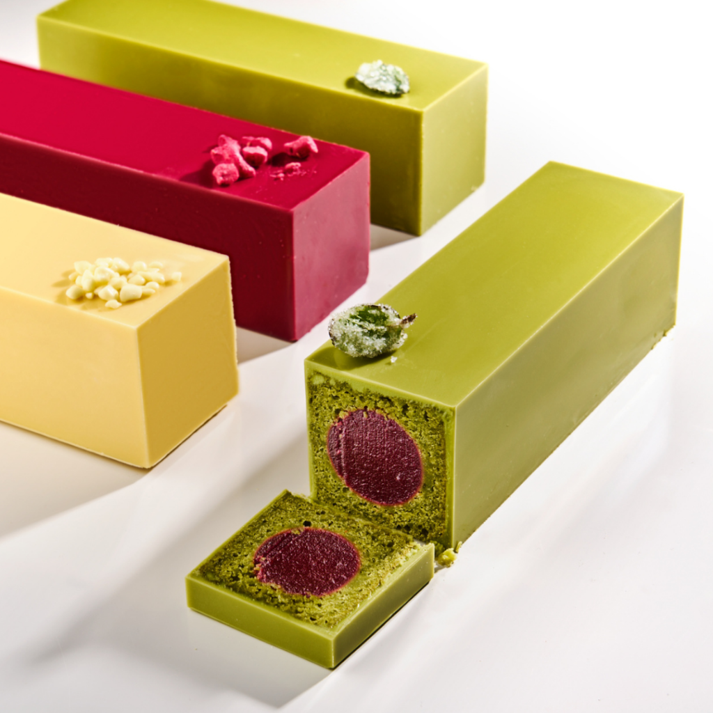 La cobertura de chocolate Ivory de Valrhona, teñida con matcha, refuerza el verde del bizcocho. Al cortar el cake, el contraste visual es contundente: verde matcha exterior, rojo cereza-frambuesa interior. No es decoración: es arquitectura sensorial donde cada capa tiene propósito técnico y estético.