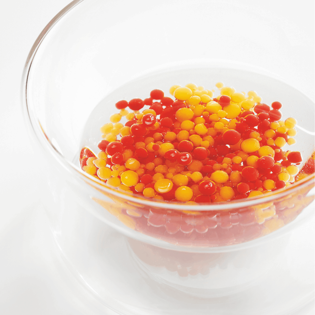 Sin embargo, para las frutas ácidas, como el maracuyá, la frambuesa o el limón, el control del pH es clave. Al ajustar la acidez, conseguimos que la gelificación con agar-agar se mantenga estable, garantizando la forma perfecta de cada esfera y una textura limpia y delicada.