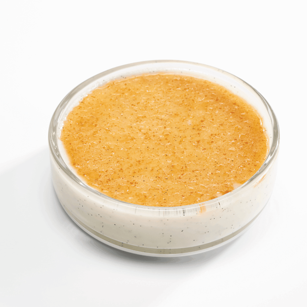 El resultado es una crème brûlée cremosa, delicada y equilibrada, con una superficie dorada que se carameliza justo antes de servir.